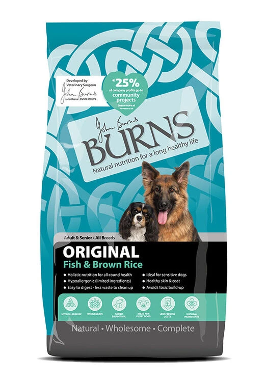 Burns Original is hypo-allergenic, so it is suitable for sensitive dogs. It is formulated without ingredients such as wheat, soya, dairy, artificial colourings and artificial preservatives which are known to cause symptoms of food intolerance including itchy skin, digestive upset, excessive moulting, full anal glands and waxy ears.