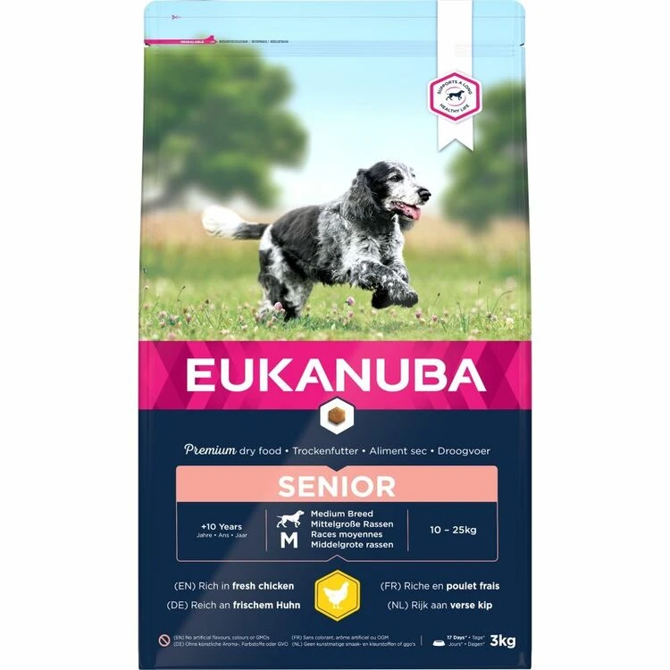 Eukanuba dry food kibbles are rich in fresh chicken and perfect for senior dogs of medium sized breeds aged from 10 years on. The selected ingredients provide tailored nutrition to boost your senior dog’s optimal body condition and active mobility. Eukanuba dry food contains L-Carnitine which contributes to the reduction of body fat and allows your dog to maintain an optimal weight resulting in less strain on the joints. The tailored fibre blend of prebiotic FOS, MOS and beet pulp promotes healthy digestion. The Eukanuba kibbles are furthermore beneficial for healthy skin and a shiny coat thanks to the natural sources of omega 6 and omega 3. Contained glucosamine and chondroitin help maintain healthy joints and mobility and calcium supports strong bones. The food also contains antioxidants vitamin E & C which are beneficial for the dog’s immune system. Additionally, the unique Eukanuba hexagonal kibbles and DentaDefense dental care system support clean, healthy teeth in the long term. The food is 100% complete and balanced. Advanced nutrition for senior dogs of medium sized breeds to support optimal body condition and lifelong wellbeing.