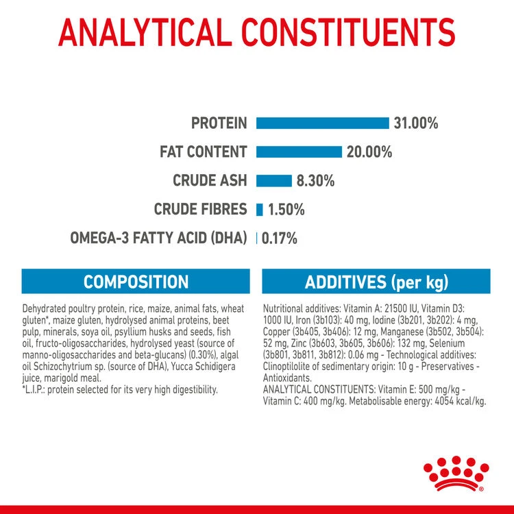 Ingredients: Composition: Dehydrated poultry protein, rice, maize, animal fats, wheat gluten*, maize gluten, hydrolysed animal proteins, beet pulp, minerals, soya oil, psyllium husks and seeds, fish oil, fructo-oligo-saccharides, hydrolysed yeast (source of manno-oligo-saccharides and beta-glucans) (0.30%), algal oil Schizochytrium sp. (source of DHA), Yucca Schidigera juice, marigold meal. * L.I.P.: protein selected for its very high digestibility.